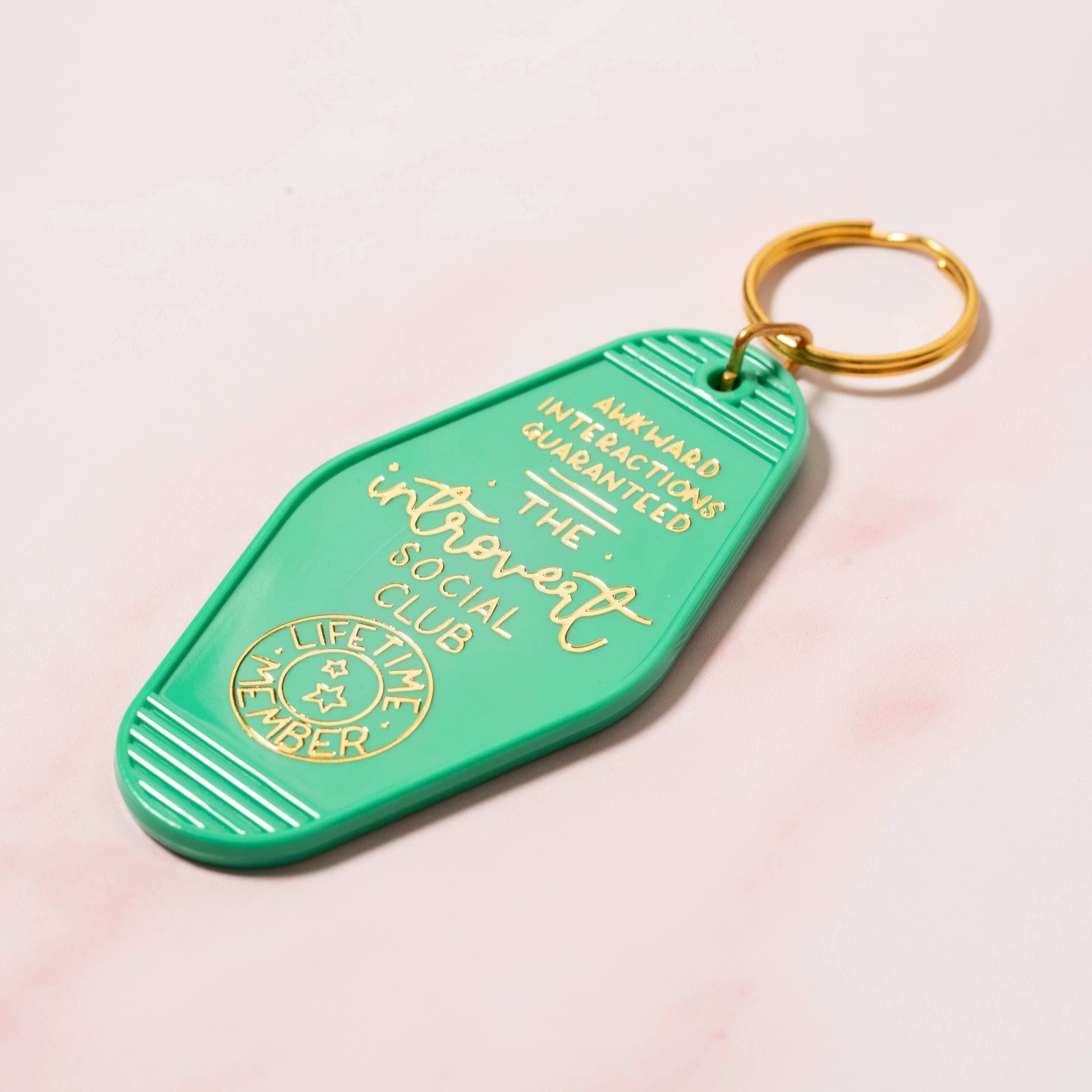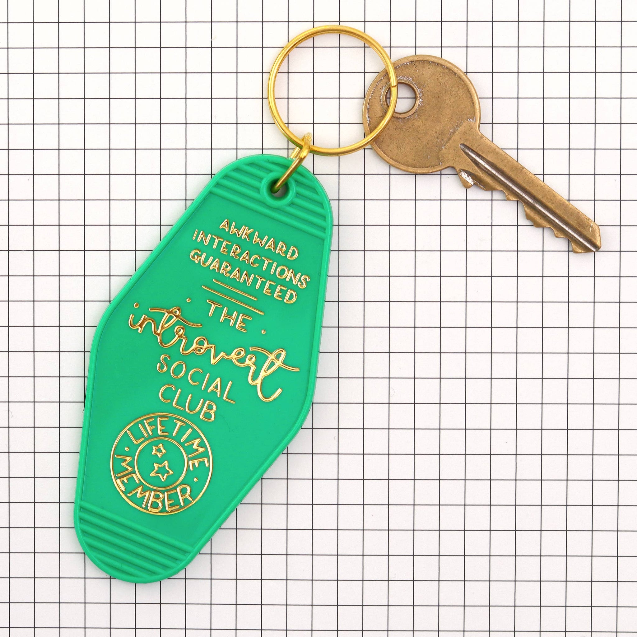 - "Awkward interactions guaranteed - The Introvert Social Club - Lifetime Member" - Green plastic motel room style keyfob - Embossed gold metallic text -...