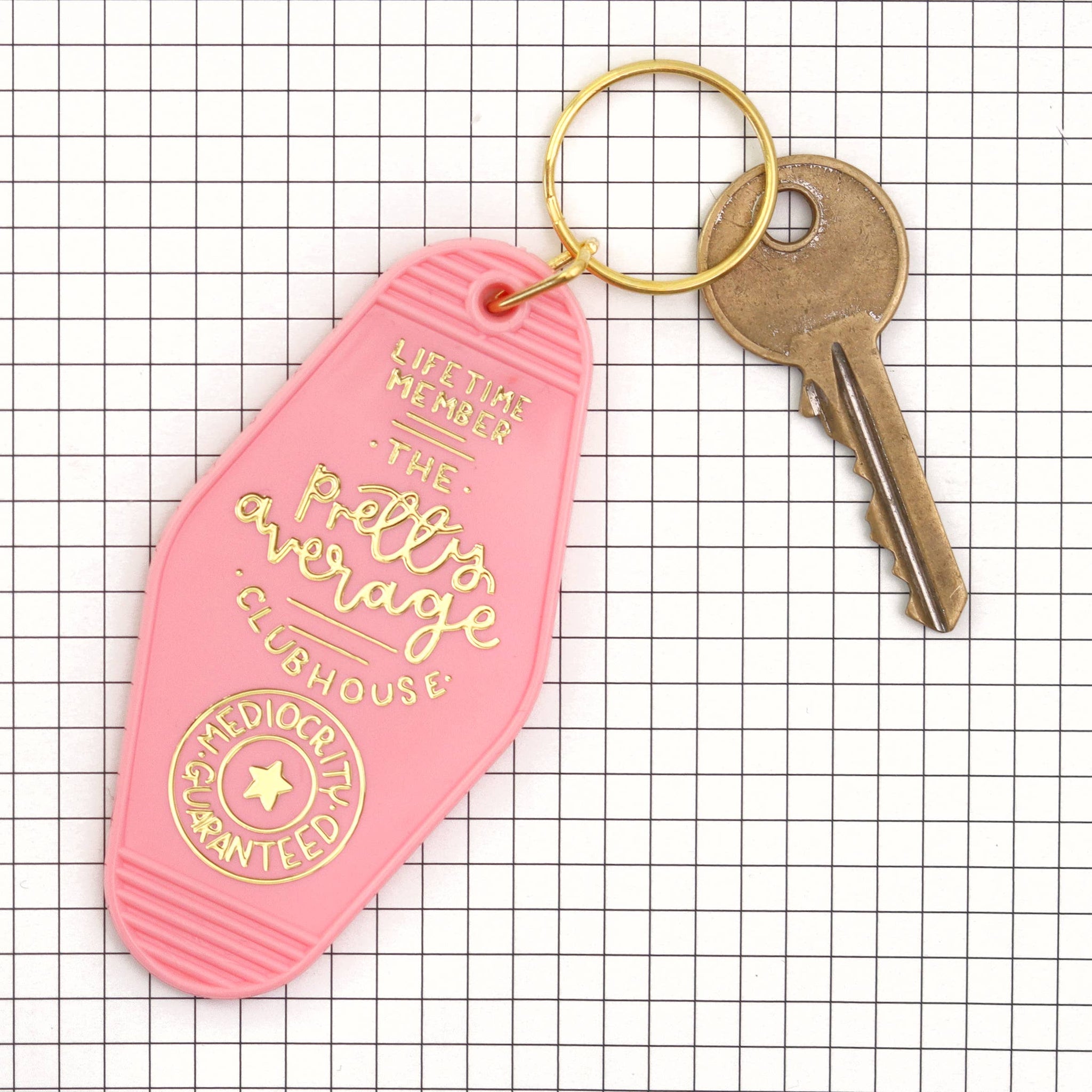 - "Lifetime Member - The Pretty Average Clubhouse - Mediocrity Guaranteed" - Pink plastic motel room style keyfob - Embossed gold metallic text - Matching gold findings - Measures 115mm x 45mm (the fob alone measures 88mmx45mm) - The keyring will be packaged on a branded backing card.