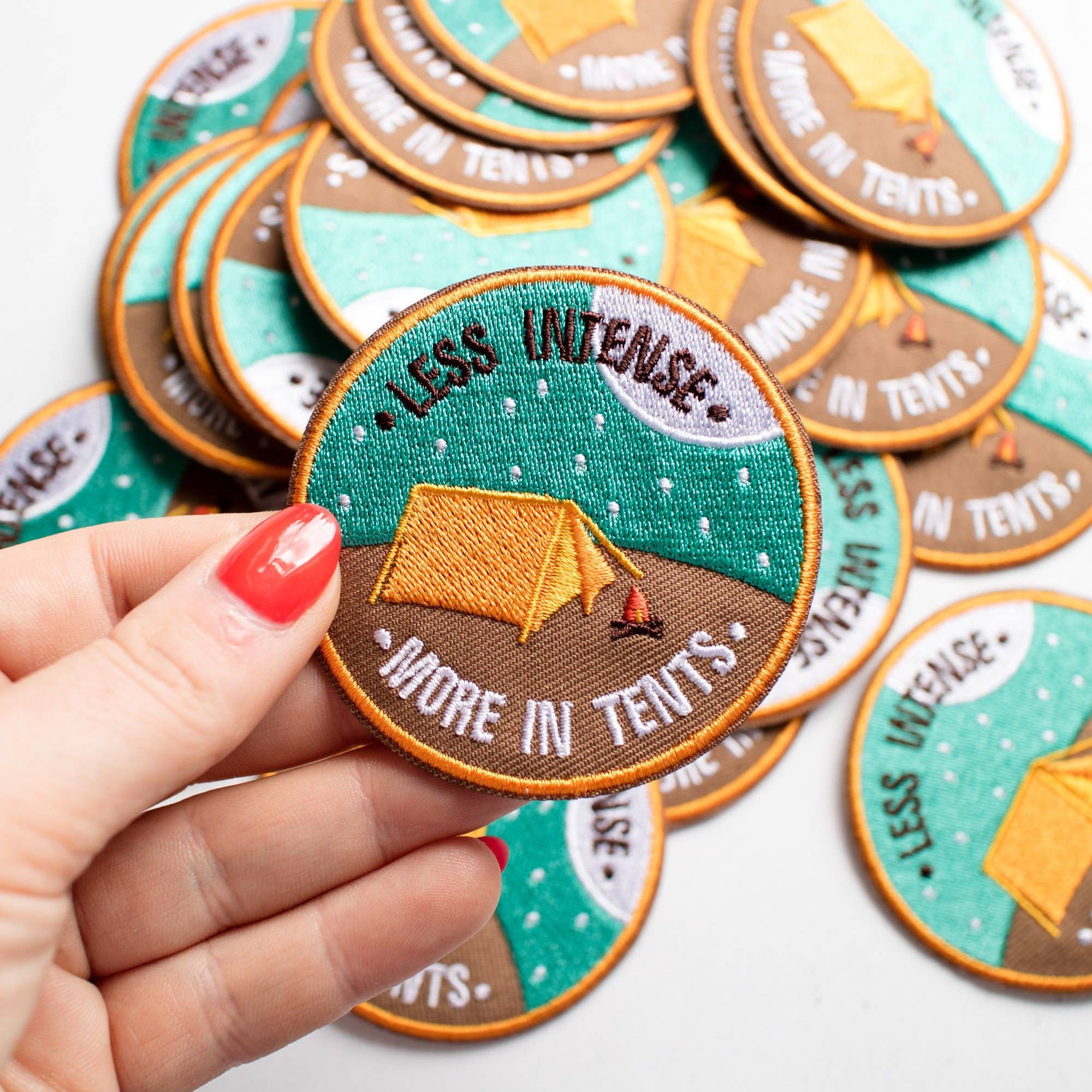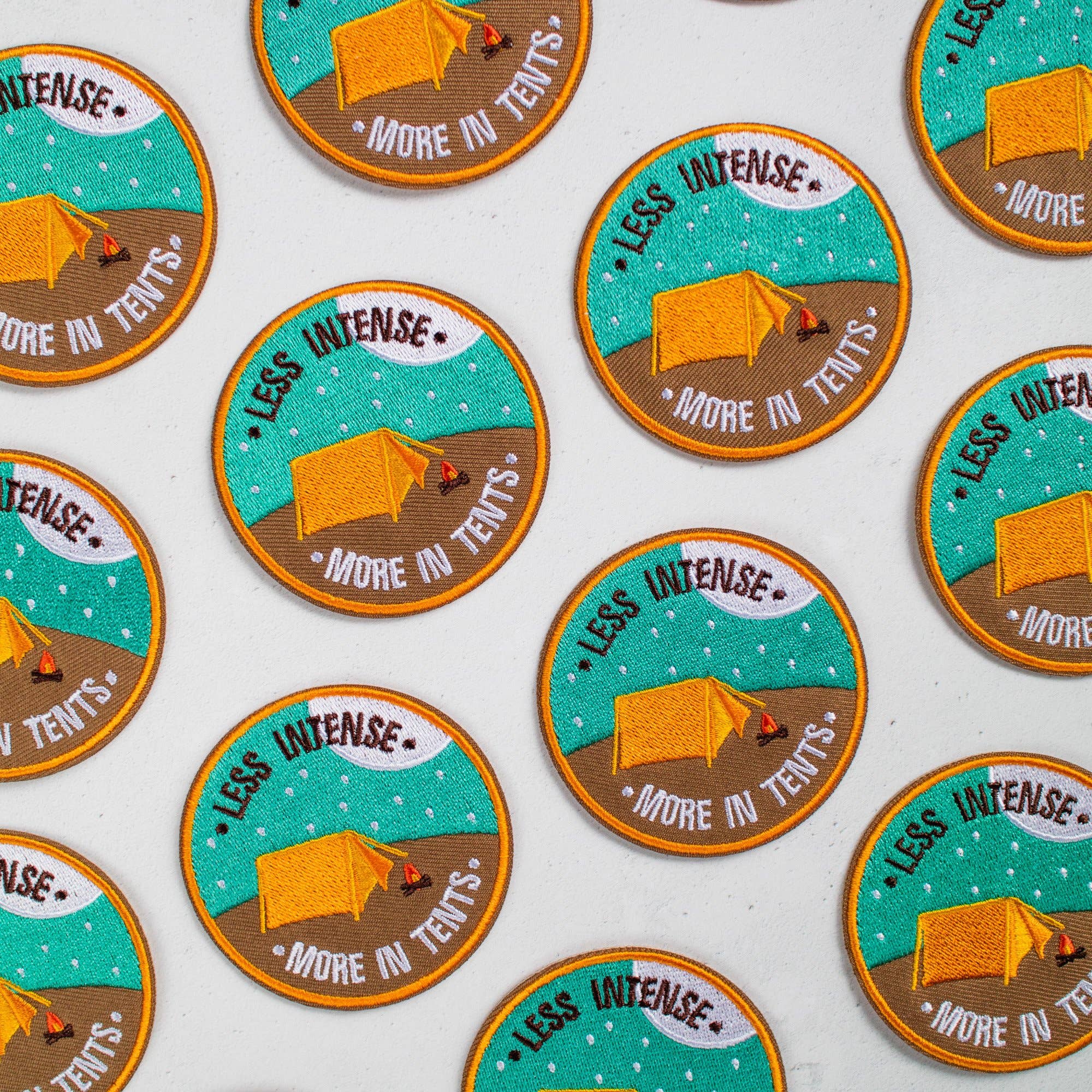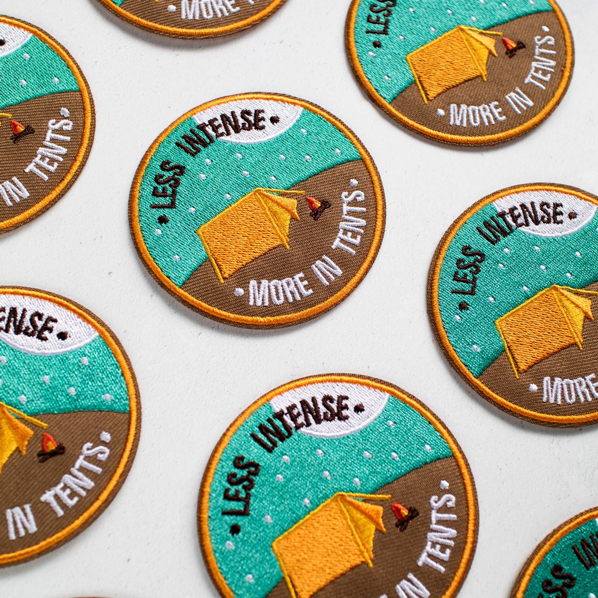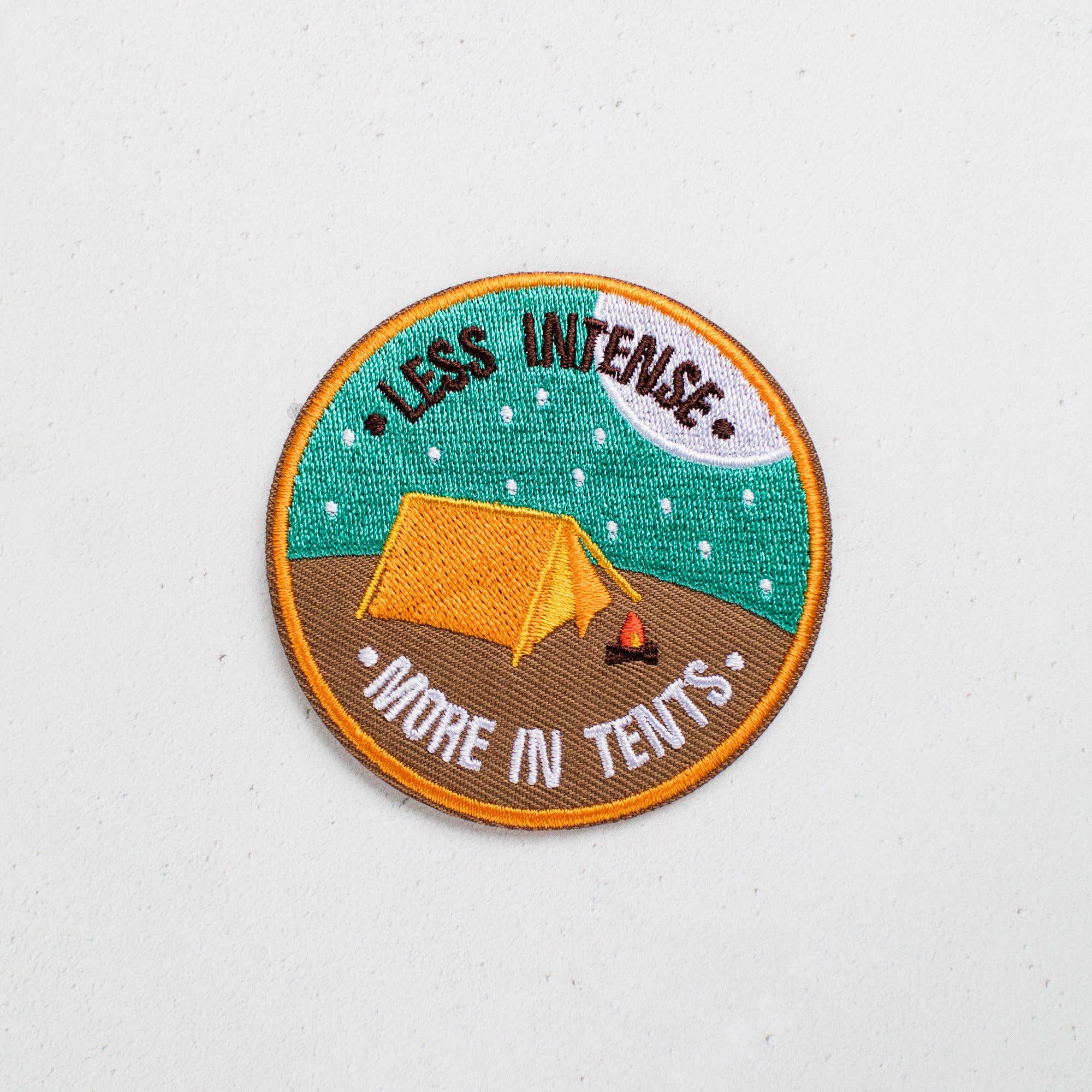 Our "Less Intense, More In Tents" patch measures 67mm X 67mm and comes displayed on a backing card.